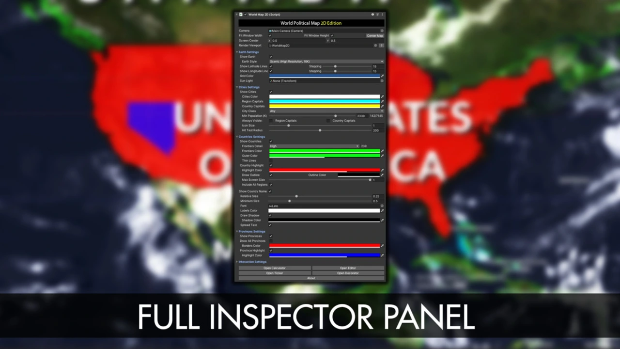 - Built for Developers: Take full control with a comprehensive API for instantiating and managing the map through code. The asset also includes a powerful in-editor Map Editor to modify or create countries, provinces, and cities, giving you ultimate control over your world.