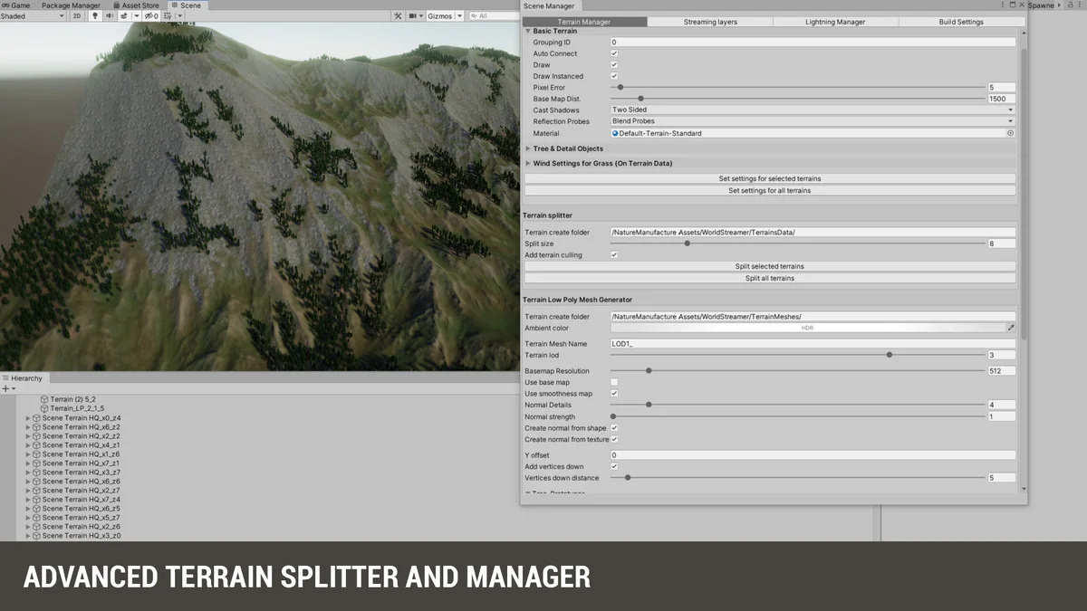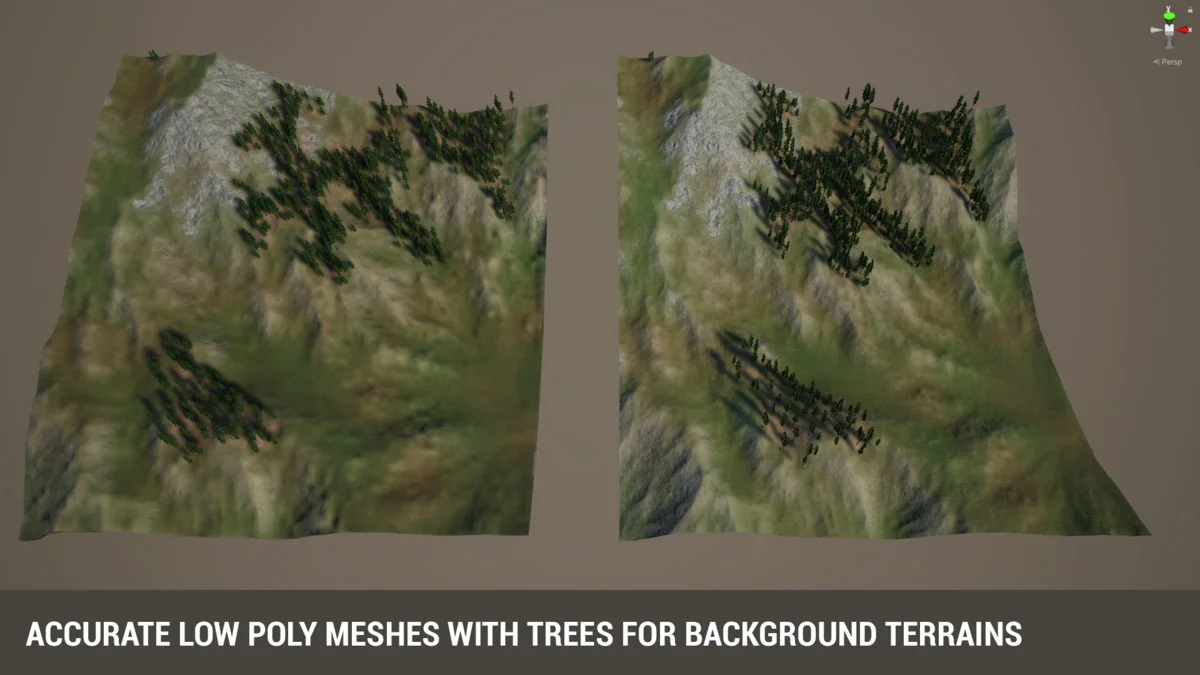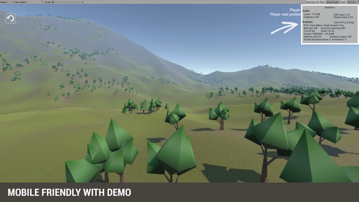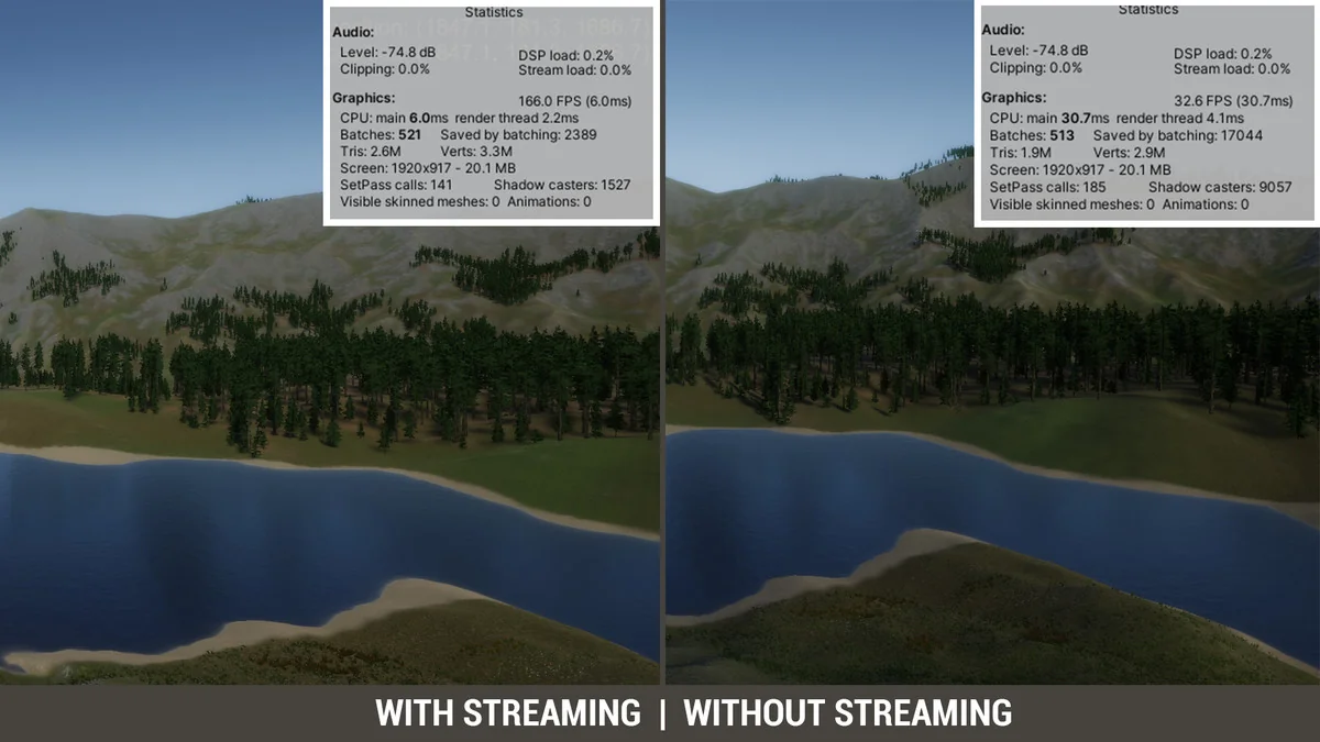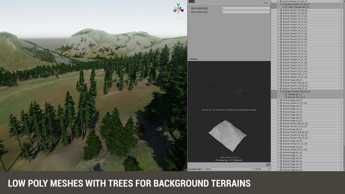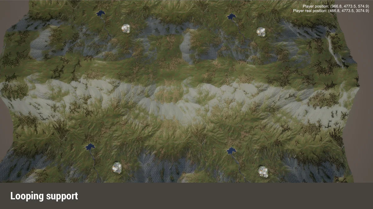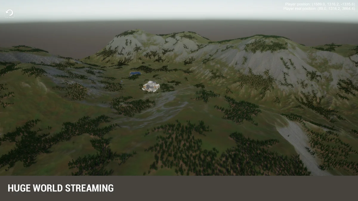 A floating point fix system is included as part of the workflow. Ring streaming is another part of the package, and it replaces Unity terrains with low-poly meshes in the far distance. The result is a workflow that keeps the visible world under control while the heavier parts of the scene are only brought in when they are needed.